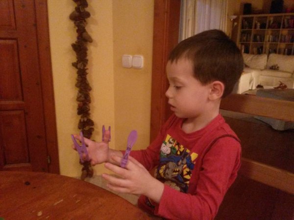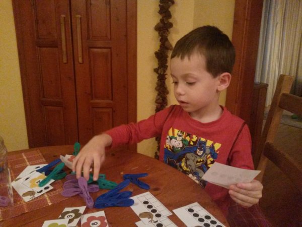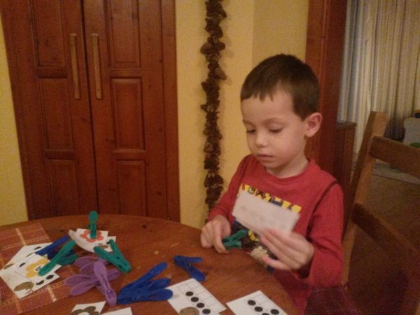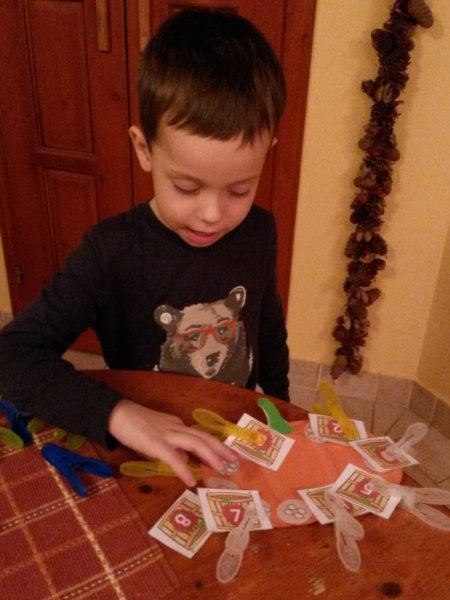 Sok más (kupakos, dobókockás, saját főzött gyurmás, ujjfestékes) játék mellett, ami igazán nagy kedvenc lett Tománál az a csipeszelés, egyszerű műanyag ruhacsipeszekkel általában számokhoz kell (a másik nagy kedvenc) a megfelelő mennyiséget csippenteni a nyomtatott anyagokból, ezek még novemberi fotók…