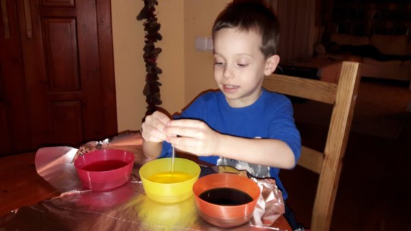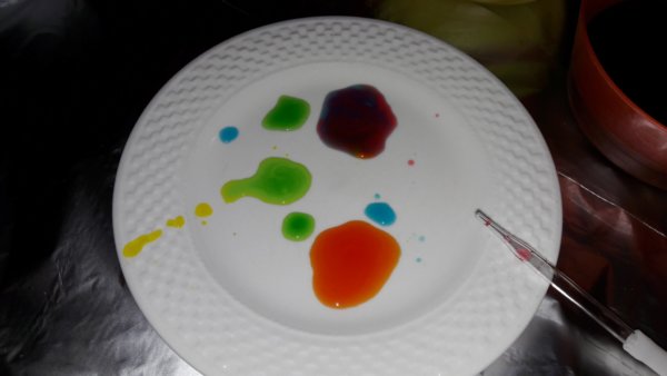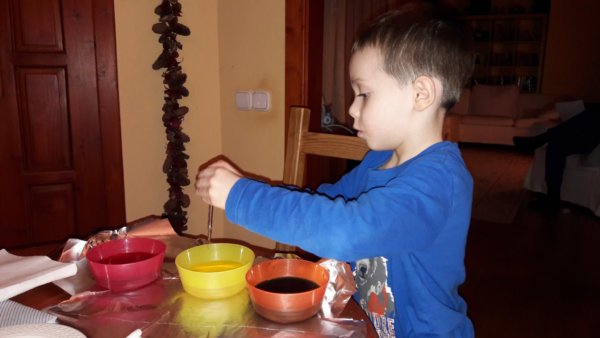 Tele lett minden – tányér, papírtörlő, szivacs, konyhai textilruha – színes pacákkal, a tányéron aztán Tomától spontán színkeverés zajlott, zöld, lila és narancssárga foltok kerültek ki a cseppentőből, tényleg teljesen magától és szórakozva jött tőle a színkeverősdi.