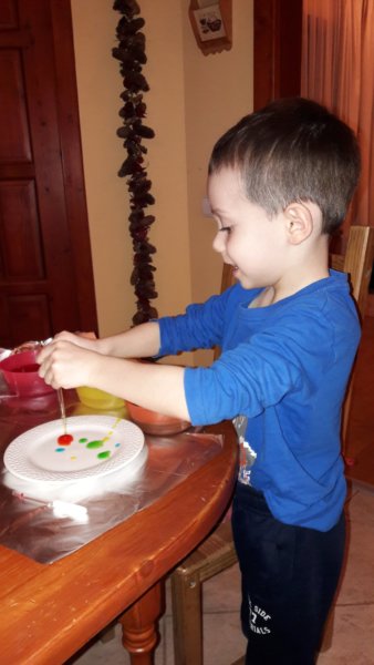 Hát pedig, mi is így jártunk és sajnálom, hogy lassan egy hónap múlva a végére érünk a dolognak, azt hiszem nálam csak Toma sajnálja majd jobban az egészet… Szóval múlt héten egyszerű gyógyszertári (10 Ft-os) szemcseppentővel és ételszínezékes vízzel volt dolgunk. Az első nap dolga az ismerkedés volt az eszközzel és mi azt hiszem, rendesen ismerkedtünk vele, Legkisebbünk szuper jól szórakozott közben, abba sem akarta hagyni 🙂 . Sárga, kék és piros vizet színeztem neki. Először simán csak csepegtettünk fehér tányérra, aztán beindult a gépezet 🙂 .