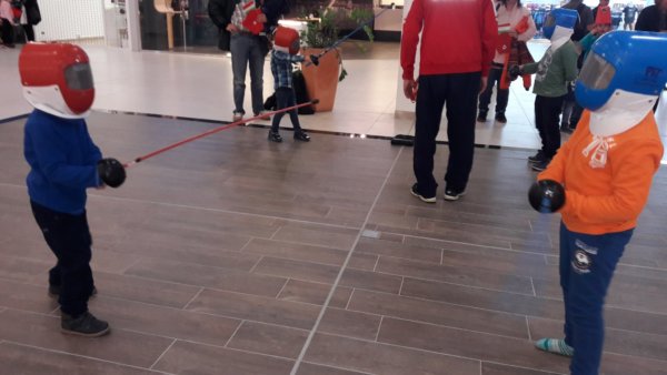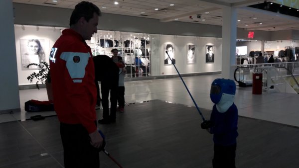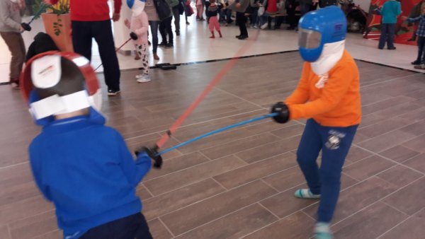 Így aztán kettecskén néztük meg a Lego Batmant, ami Legkisebbünknek nagyon tetszett, hát én azért annyira nem voltam elragadtatva tőle 🙂 … Általában szeretem a gyerek filmeket, de ez most nem nagyon tetszett, bár Toma tényleg szerette, még másnap is emlegetett belőle néhány vicces részt, és ez a lényeg 🙂 . Utána a Plazában, ahol voltunk, nyilván március 15-hez kapcsolódva tele volt minden huszárokkal, kézműves asztalokkal és a közeli sport klub kitelepült vívó tagozatával. Ez utóbbinál ki lehetett próbálni a vívást és ez mostanában Tománál nagyon bejön, itthon a mindenféle kardjaival állandóan vív valakivel 🙂 , még viccesen emlegettük is, hogy a foci, futás, torna és egyéb sportok mellett, lehet, hogy a vívást is felvehetnénk a lehetséges sportágak közé 🙂 . Persze kipróbáltuk, először még kicsit bátortalanul kardozott a kicsit nagyobb ellenfelével, de aztán egyre jobban belejött.