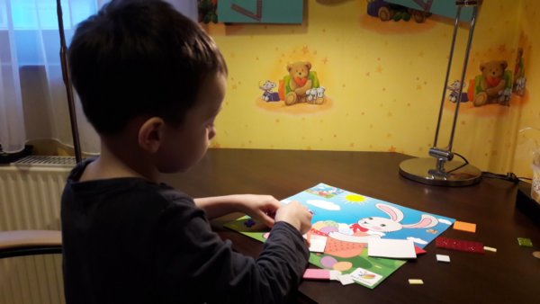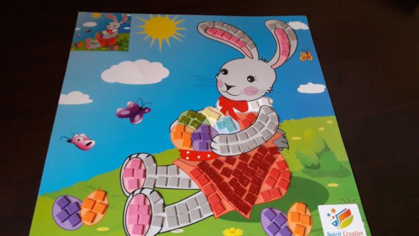 Ilyen volt elsőként a mozaik nyuszi, amit még az oviban rendeltünk-vettünk az ünnep előtt és mindjárt a szünet első napján, Toma neki is állt elkészíteni. Nagyon aranyos volt, ahogy koncentrálva dolgozott a kis mozaik kocák leszedésén és a helyükre ragasztásán 🙂 :