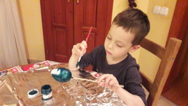 Azt hiszem másnap egész délután tojást akart festeni Toma, de mivel akkor én szinte egész nap suvickoltam és ügyködtem itthon, valószínűleg elbeszéltünk egymás mellett, mert én a szokásos tojásfestésünkre gondoltam, és próbáltam csitítani, hogy azt majd egy másik nap csináljuk, mert arra akkor éppen nem volt érkezésem. Jó késő délutánra derült ki, hogy ő nem is arra gondolt, hanem csak egyszerűen tojásokat szeretett volna festegetni 🙂 . Ennek csak annyi akadálya maradt, hogy mivel egyáltalán nem is gondoltam ilyesmire, nem is készültem se műanyag, se hungarocell tojásokkal. De a játszószobát feltúrva tudtam én, hogy kell lennie az előző évekről maradéknak, elő is kerültek, összesen 8 darabot találtam vegyesen, az pont elég is lett 🙂 . Hurkapálcákra nyomkodtam őket, Legkisebbünk pedig zöld és bordó akril festéket választott a festéshez, más szín nem jöhetett szóba 🙂 és villámgyorsan és hozzáteszem nagyon szépen, ki is pingálta őket: