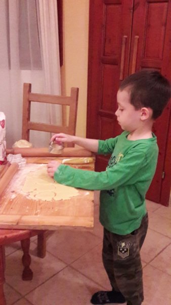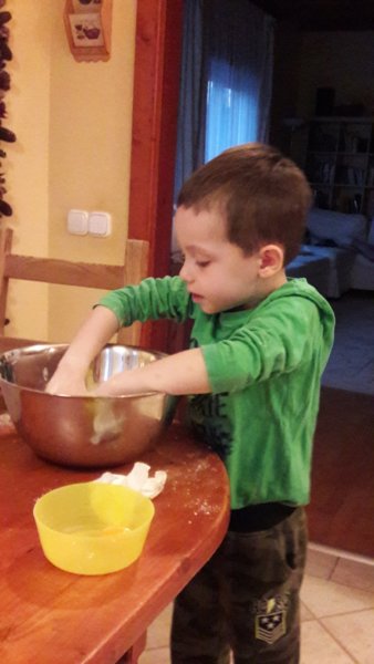 Pénteken az egész napos barátos kiruccanásunk után, úgy éreztem muszáj elkezdeni valami sütit sütni, egyrészt mert akkor már péntek este volt és még semmi finomságunk nem volt, másrészt meg ha már olyan jól bevásároltunk a sütikhez, nem ártana sütni is 🙂 . Így aztán még este összedobtuk a linzer kekszet, Toma gyúrta össze az egészet, pedig az nem is olyan könnyű szerintem, hogy összeálljon, de ő nagyon élvezte végig 🙂 :