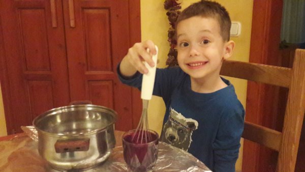 Persze a piros, kék, zöld, sárga tojások festése nem maradhatott el, mert az Toma kedvence, azt hiszem azért, mert a habverős módszernek köszönhetően végig egyedül csinálja az egészet: a főtt tojást a habverőbe teszi, bele a színes vízbe, vár vele és amikor kész, kiszedi papírtörlőre. Évek óta így csináljuk, ő pedig imádja 🙂 :