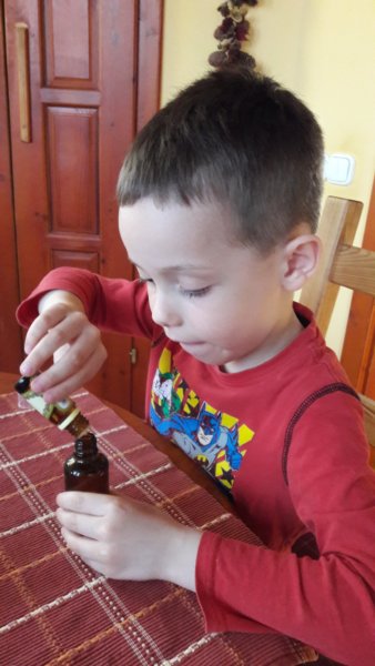 Tavaly kezdtük, de a nagy sikerre való tekintettel most sem maradhatott el a házi kölnivíz készítése 🙂 . Toma már napokkal korábban a tudtomra adta, hogy ő szeretne olyan izét készíteni, amit csepegtetni kell 🙂 . Ebből leszűrtem, hogy mire gondol, úgyhogy elfelejteni sem tudtam volna. Előrelátóan a patikában vettem flakont és hozzá fújó fejet (tavaly még azt hittem naivan, hogy a kiürült parfümös üvegek fejét le tudom szedni), az más kérdés, hogy csak nem túl szép barna üvegcsét kaptam, én meg olyan kis átlátszóra gondoltam, de azt mondták, hogy olyan nem is szokott lenni… De nem ez volt persze a lényeg, az egyik vízbe Legkisebbünk levendula-citrom illóolajat, a másikba gyöngyvirágot csepegtetett, ez utóbbi nagyon ízlett neki, ő ezzel locsolkodott Máté meg a másikkal 🙂 :