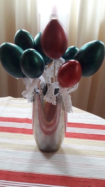 Száradás után a szintén valahonnan előkotort maradék csipkeszalagokkal feldíszítettem a tojáskákat, amiket vázába raktunk és az ünnepek alatt az asztalt díszítette:
