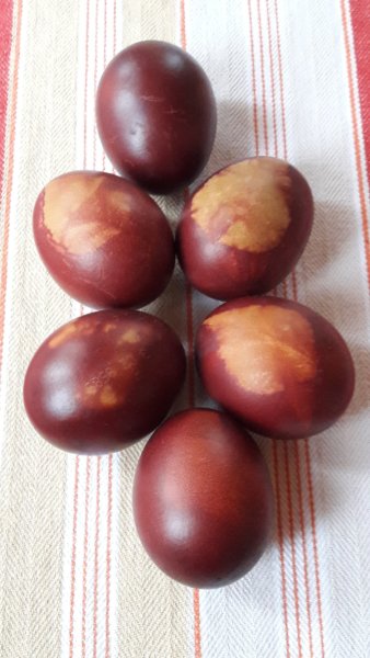 Idén először hagymahéjjal színezett tojásokat is csináltunk, én már évek óta terveztem, de mindig elmaradt valamiért, most viszont, hogy Tomáék az oviba ilyet festettek, megadta a végső lökést 🙂 , mert az olyan szép lett. A kertből szedtünk leveleket, aztán a hagyma héjakat és a sima tojásokat Legkisebbünk rakta a lábosba, amire leveleket tettünk azt beletettem harisnyába, majd felfőztük az egészet és egy éjszakát állni hagytuk, szerintem szépek lettek 🙂 :