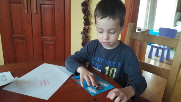 A keddi, esős délutánon csináltuk Tomával ezt a kis térbeli képet, mert nem elég, hogy esett az eső, még elég hűvös is volt! Na, meg volt itt minden az elmúlt hetekben, mint tudjuk, csak tavasz nem nagyon… Én vágtam, Toma ragasztotta 🙂 :
