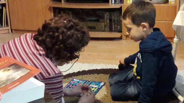 Az idő elég pocsék volt eleinte, még esett is többször, és ez merőben keresztülhúzta minden egyéb tervünket, ami vagy bobozás vagy állatkertezés lett volna. Így aztán inkább visszamentünk Veszprémbe Kati mamához, aki rém boldog volt, mert már karácsony óta nem találkoztunk, meg mondanom sem kell mi is nagyon örültünk neki 🙂 . Az unokatesóméknak dolguk volt, ezért csak hozzá mentünk be, de pont jó is volt így, mert két óránál többet nem tudtunk maradni, ugyanis Máté Apával Fradi meccsre ment este. Amíg együtt voltunk persze kávéztunk 🙂 , beszélgettünk, természetesen Toma befogta a nagyit egy kis társasra is (Ki nevet a végénre, természetesen 🙂 ),