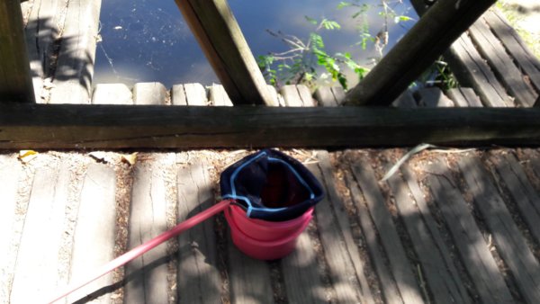 Beljebb mentünk az ösvényen és végre megjött a szerencsénk, icipici ebihalakat sikerült fáradságos munkával megfogni 🙂 , mert ezek a kis halak igencsak fürgék, már a háló árnyéka is iszkolásra készteti őket. Kifogtunk két pici halat, betettük a vödrünkbe, aztán még sokáig próbálkoztunk, de ennyi lett a végeredmény, aminek Toma azért nagyon is örült 🙂 !