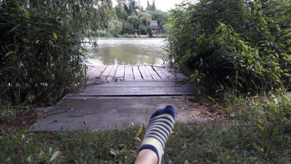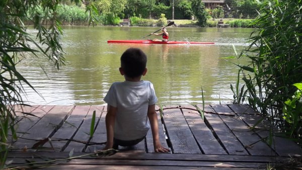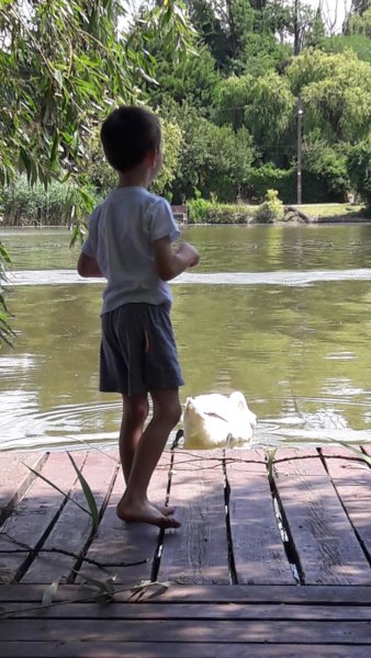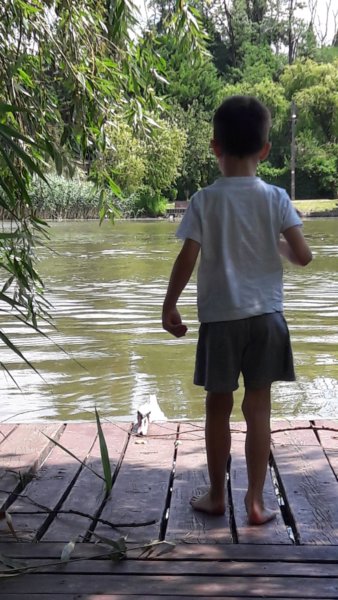 Nem gondoltam, hogy órákig maradnánk, pedig így történt… Toma mostani kedvencére, a stéges és fára mászós helyre pakoltunk le. Egyből előkerültek a finom kekszek a dobozból, aztán ment a láblógatás, pléden heverészés, kavicsdobálás, a kajakosok-kenusok-hajósok bámulása, békák, vízisiklók és a ki-kiugró halak figyelése. Hozzánk csapódott egy hattyú is, mivel sokáig velünk volt, még nevet is kapott, Vili lett 🙂 , kijött a partra is, de aranyos volt, tisztes távolból totyorászott körülöttünk, nem úgy mint például a kompnál lévő társai, akik olyan erőszakosan jönnek felénk néha, hogy otthagyjuk őket. Őt viszont nagyon bírta Toma, kapott persze a gofriból is 🙂 . Aztán kártyáztunk nem is keveset, meg Legkisebbünk fára mászott természetesen, ha már ott ültünk mellette. Közben mivel arra járt, leült hozzánk Jutka néni beszélgetni egy picit, ő az, aki kiskorában Mátéra vigyázott, ha éppen úgy adódott, de sajnos már nem vállal ilyesmit, mert betegeskedett egy időben, pedig azt hiszem a fejem se fájna, ha nem vonult volna vissza 🙂 .