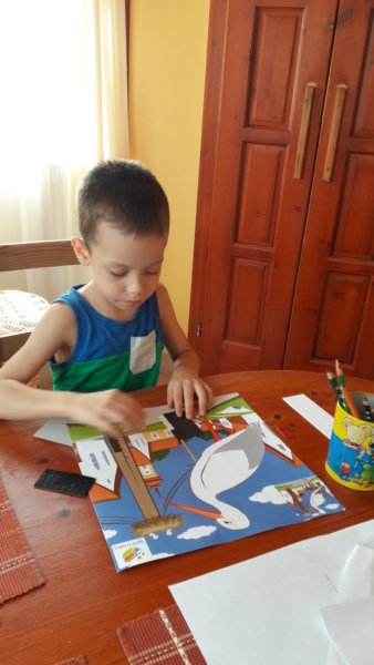 Szombat délelőtt eleredt az eső és csak esett 1-2 órán át, így mivel már jó régen nem csináltunk semmi kreatívságot, elővettük a még az oviból rendelt gólyás mozaik képet, amire Toma örömmel ragasztgatta az apró kis darabokat, amíg én a dolgomat végeztem 🙂 . Nem készült el teljesen, szerintem ma fejezi be az alkotó 🙂 …