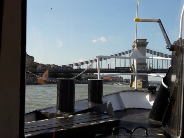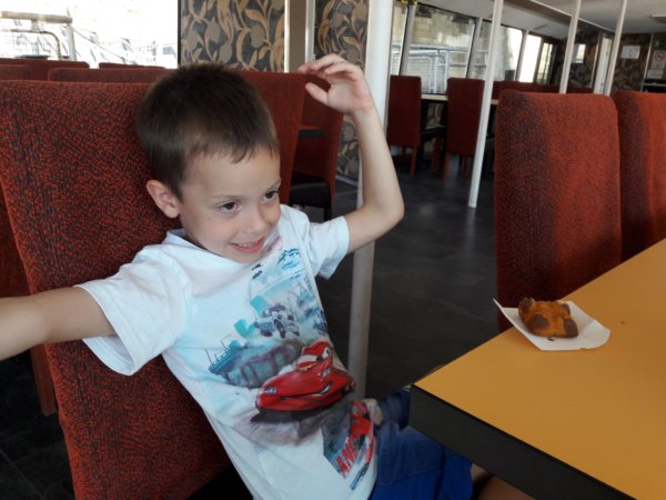 Úgyhogy hazavittük Benit, onnan pedig továbbmentünk, leraktuk az autót és most végre hajóval mentünk a Margitszigetre! Múltkor a Vizes VB-nél azt olvastam, hogy nem állnak meg a hajók a szigeten, úgyhogy akkor villamosoztunk és gyalogoltunk, most sokkal jobb volt így, hogy már a szigeten szálltunk ki. A MÜPA-tól indultunk, abban reménykedve, hogy fent is lesz helyünk, de amire jegyet vettünk fönt a hajó nyitott terében már alig volt egy-egy hely, így inkább lementünk a zárt térbe, ami akkor még üres volt, de szép lassan megtelt persze ott is minden. Az út egy órás volt, a fiúk ettek-ittak, nyitott ablak mellett ültünk, jó volt 🙂 :