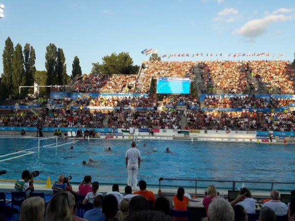 Apuci már a bringó kölcsönzőnél várt minket, ahonnan már egyenesen az uszodába mentünk és még volt idő egy kávét is meginni, amit külön nagyon értékeltem 🙂 . A meccs az pedig fergeteges volt! A hangulat is megint magával ragadó volt, bár kicsit halványabb volt, mint a Vizes VB-n, de így is nagyon élvezetes volt! A meccs pedig szó szerint parádésan sikerült, ez a milleniumi csapat, nem véletlenül nyerte sorra az olimpiákat, tényleg aranycsapat, én is mindig nagyon szerettem őket! Unalmas is lehetett volna a meccs, mert 24-5-re nyertek, de ennek ellenére inkább a szép játékban gyönyörködtünk és a felétől már kezdtem sajnálni az olasz ellenfelet 🙂 … Persze mindenki jól érezte magát, de Tomát külön ki kell emelnem, ő volt a környék leglelkesebb szurkolója, akkor is kiabálta a ria-ria-Hungáriát, ha más senki és biztatott, hajrá Magyarországozott, miközben szorgosan és hangosan számolta a gólokat 🙂 .