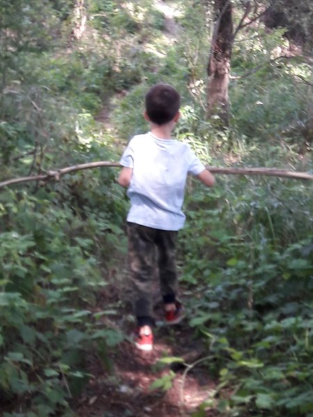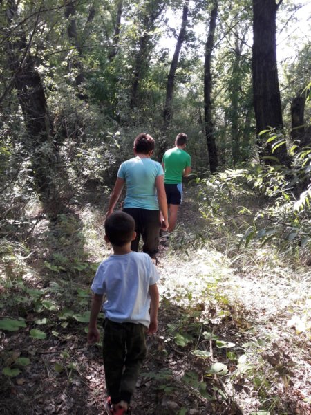 Volt, aki takarított, volt, aki ebédet főzött azon a péntek reggelen, aztán délelőtt csak elindultunk, Zsuzsival nagy fia is jött, aki ettől az évtől egyetemista és ott ugye később kezdődik a tanév, mi meg csak simán lógtunk ugye az oviból, így mi meg Tomával ketten indultunk úznak. Legkisebbünk aznap nem volt formában, rettentő nyűgös volt, minden baj volt, már lehet, hogy az is, hogy fel kellett kelni, előző nap voltunk ugye a csúszdáknál és egyébként szerintem sok volt neki az a nap, meg a nyári programkavalkád is, elfáradt egy kicsit úgy tűnt és akkor a nyughatatlan anyja, még egy sima pénteket sem hagy meg csak úgy magában, borzasztó 🙂 ! Az volt a legszörnyűbb, hogy a biciklijét nem hozhatta a néhol gumicsizmás ártérbe 🙂 és az elején kifejezetten sokat nyűglődött a Drágám, de a végére csak belejött a túrába. Meneteltünk a jól ismert kiserdőnkön túlra, ahová nem nagyon szoktunk mi menni, mert mint mondtam eléggé sűrű a növényzet, Zsuzsiék nem is találták azt az ösvényt, ahol menni szoktak, ha nincs ott a fia, biztos nem gázolunk át a vadregényes füves-indás szakaszon, visszafelé már a konszolidáltabb, de hosszabb úton jöttünk azért 🙂 . Aztán csak elértünk oda a másik kiserdőhöz, ami tényleg árteres és szerintem csodaszép és tele van éneklő madarakkal, meg fa susogással, erdő neszekkel és illatokkal, nagyon szép, remélem megmarad nekünk még sokáig, bár tényleg pici és csak egy ösvényen járható, de tényleg olyan, mintha sok-sok kilométert utaztunk volna és valahol az erdő mélyén gyalogolnánk 🙂 . Ilyen volt előttem a felderítő csapat: