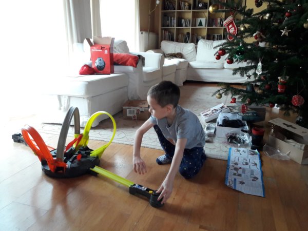 Utána egész délelőtt főleg Toma játékaival játszottunk, hol együtt, hol külön-külön, a Családfő még elemért is elszaladt, szerencsére még minden nyitva is volt, mert amik itthon voltak, nem voltak jók a Hot Wheels pályába 🙂 … De társasoztunk, bombát hatástalanítottunk az egyik ajándék jóvoltából 🙂 , meg autóztunk ugyancsak a pályán, szóval folyamatosan játszottunk, Toma itt már dél körül, még mindig pizsamában 🙂 :