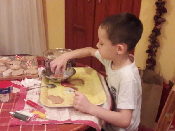 Ez volt az ejtőzős napunk, délután filmet néztünk, megint csak olyat is, amit már sokszor láttunk a Dennis a komiszt, de új értelmet nyert Toma miatt, aki nagyon jól szórakozott rajta, meg mi is élveztük Mátéval együtt, újra az egészet 🙂 . Estefelé nem tudom milyen felindulásból, de nekiálltam mézest díszíteni, mert alig volt készen pár darab és olyan jól esett az akkor valahogy 🙂 . Persze csatlakozott Toma is, egyszerű cukormázasat csináltunk, porcukrot egy kis forró vízzel higítottam, cukorgyöngyöt nyomkodtunk bele, volt amit díszítőtollal rajzoltunk meg, szépek lettek 🙂 . Toma meg nagyon ügyes volt, újított egy jót, nem kenegette a mézeseket, hanem szépen megfürdette őket a mázban, sokkal hamarabb készen lettünk 🙂 …