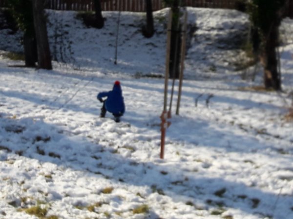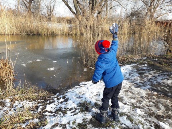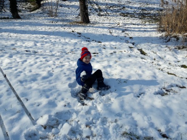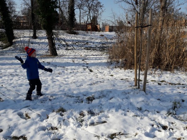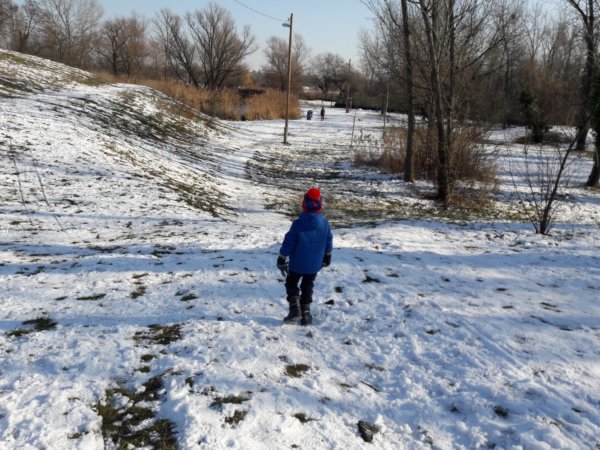 Még hétfőn váratlanul be kellett szaladnunk az oviba SZMK-ügy miatt, csak engem értek el az egész ovi hivatalos szülői közül ténylegesen is, és délig alá kellett írni egy házirend változással kapcsolatos papírt, hogy hivatalos legyen. Ha már egy ilyen plusz utunk volt és velem volt persze Toma is, hazafelé megálltunk a dunai kedvenc, kis körünknél, csak a másik irányból kezdtünk sétálni, mint ahonnan szoktunk. Még volt valamennyi hó, Legkisebbünk nagyon élvezte az egészet, próbáltunk hógolyózni, de inkább csak a nagyobb hó rögöket dobáltuk egymásra, mert nem tapadt a hó, aztán Toma kitalálta, hogy célba dob, először egy kis fa és támasztója közötti résre dobált, aztán a kissé befagyott Dunát vette célba, legurult a havas domboldalon (itt már kicsit aggódtam az állapota miatt ugye 🙂 ), szaladgált, és a végén még bújócskáztunk is, meg sétáltunk. Amikor erre járunk, télen-nyáron útba szoktuk ejteni a cukrászdát, ami a közelben van, de mi sem mutatja, hogy még igazi tél van, a cukink ki sem nyitott, ugyanis januárban mindig zárva van… Toma nagyon élvezte, el is fáradtunk a végére, szeretne még menni, ami nem akadály, csak már havat sehol nem fogunk találni 🙂 …