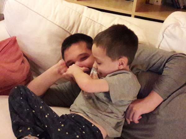 Ritka alkalom, hogy lefotózhatok ilyesmit, természetesen nem Toma miatt 🙂 , pedig akár mondhatnám életképnek is, mert ez mindennapos nálunk… Nagyon jó tesók ők 🙂 , Toma tulajdonképpen ha tehetné, egész végig Máté nyomában lenne, amikor itthon vannak mindketten 🙂 , betelepszik a szobájába, behívja amikor fürdik, igyekszik mindenhol mellette lenni. És mindez Máténak sincs ellenére, örül ő is a tesójának, sőt, néha még külön lejön hozzá a szobájából, hogy megkeresse, ha valamiért nincs jelen az “árnyéka”, amikor a tanulnivalóktól nem tudnak játszani, beígér neki külön időpontokat, amikor bepótolják a lemaradást és még be is tartja, bár az öccse szerintem nem hagyná, hogy elfelejtse 🙂 … Persze van amikor összezördülnek, de ritkán, most nem is tudnám megmondani, mikor történt ilyesmi utoljára. Ilyenek ők együtt 🙂 :