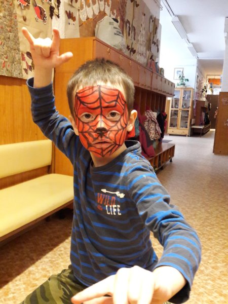 Az ovis napok is nagyon gyorsan telnek, hétfőn, még a farsang utolsó előtti napján vetélkedő volt a csoportban, pillecukrot, tejszínhabot és még más nyalánkságokat ettek a gyerekek, a tejszínhab evésben második lett Legkisebbünk 🙂 . Tegnap pedig buli volt bent, játszottak, táncoltak, és arcot is festett nekik Julcsi néni, Toma Pókemberként jött haza 🙂 :