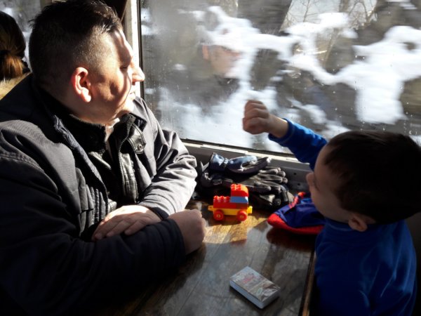 egész pontosan addig, amíg meg nem érkezett a különjáratos nosztalgia kocsis vonatunk. Erre, egy épített legó vonattal ingyenes volt az utazás a gyerekeknek, mi nagyon nem bíbelődtünk az építéssel, reggel Toma összerakott valami mozdony szerűt és már vittük is. A vonatozás nagyon jó volt, kis asztalkás ülőhelyek voltak a vagonban, jó melegben utaztunk, ami nem volt hátrány a -6 foknál 🙂 . A János-hegyig ment a különjárat, közben megcsodáltuk a csodaszép havas erdőt, tényleg egy élmény volt, még az ablakon keresztül is.