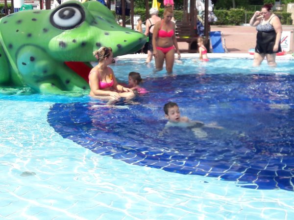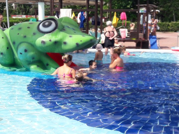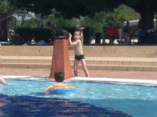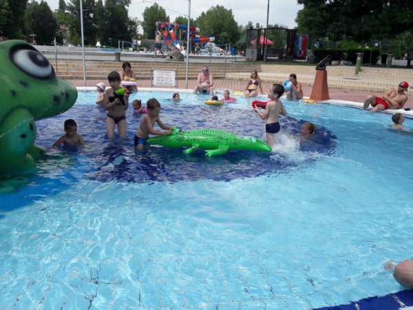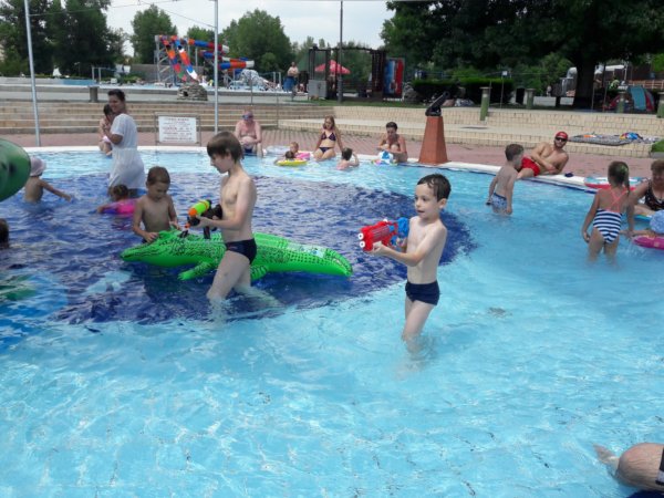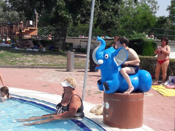 Már nem akarom úgy kezdeni a mondókámat, hogy ez is legalább két hetes történet, pedig így van 🙂 . Még az iskola utolsó hetében jártunk, Toma már nem ment oviba, a ballagás után voltunk nála és nagyon meleg volt. Tavaly egyszer sem voltunk a csepeli strandon, mert valahogy kezdek a strandokkal nem olyan jó viszonyban lenni, mint korábban, de gondoltam ilyenkor, amikor még ovi és suli van, nincsenek annyian egy sima hétköznap délelőtt, így is volt. Azt hiszem hétfő volt és mi 9-kor már a strandon virítottunk, a gyerekmedence különben is kellemes hőmérsékletű, de már a reggeli órákban hőség volt. Kicsit mindig úgy indulok el ilyen helyekre, ahová jól jönne a gyerektársaság, hogy hát lehet nem lesz olyan vidám a dolog, mert csak ketten vagyunk… Éppen ezért felszerelkeztem két vízipuskával (amit nagyon jól tettem) és még kártyát is vittem magunkkal, nos ez utóbbit nem használtuk 🙂 … Aggodalmaim alaptalanok voltak, mert most is, mint már oly sokszor beigazolódott, hogy úgyis lesz gyerektársaság, ha nem úgy indulunk neki, akkor is. Konkrétan az történt, hogy az első 10 perc után Toma összeszedett egy ideiglenes cimborát, akivel jól vízipuskáztak órákon át, aztán a kisfiú elment ebédelni, majd nem sokkal később mi is lángosozni. Előtte és persze közben is azért volt békás csúszdázás (meg a tetejéről ugrálás 🙂 ), ágyúból és elefántból vizezés 🙂 :
