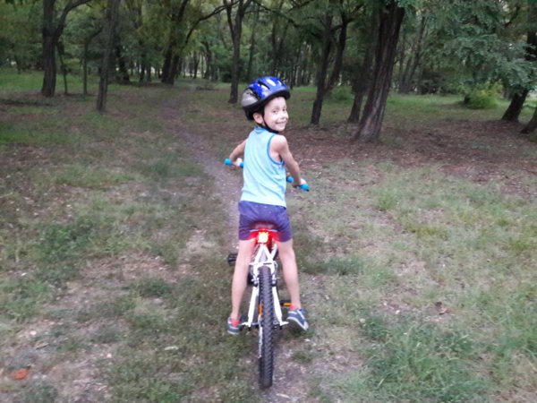 Toma szülinapi ajándéka a bicikli, sajnos nem lett tökéletes. Egy picit nagy neki, ugyan tud vele menni, de nem az igazi, nem teljesen kényelmes. Gondoltuk mi balgák, hogy mivel úgyis ismerősnél vette a Családfő, biztos simán visszacserélhetjük, mert mondta is, hogy nem gond, ha nem jó, viszont nem számoltunk Tomával, akinek annyira tetszik az új bringája, hogy nem akar tőle megválni 🙂 … Mondjuk annyira nem bántam, hogy nagy neki picit, mert mint utóbb jobban megvizslatva rájöttünk, hogy ez egy BMX bringa, ugratni is lehet vele és hasonlók, szóval nem baj, ha várunk vele 🙂 … Akár maradhatott volna ennyiben is a dolog, mert jövő tavasszal biztos jó lenne már Tomának vagy nyár elején, addig meg ugye itt van az eddigi bicó, de Apa nem hagyta ennyiben a dolgot és elmentünk pénteken a Decathlonba Tomával felszerelkezve és vettünk neki biciklit, amit saját maga próbált ki. Hát, azt az örömöt, jó volt látni tényleg 🙂 ! Le sem szállt róla az üzletben, végigjárta biciklistül az áruházat 🙂 és mindez itthon is folytatódott, sötétedésben mentünk ki vele, mert muszáj volt menni az újjal, lámpával jöttünk már haza.