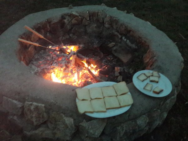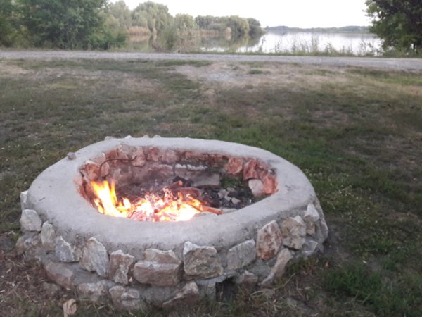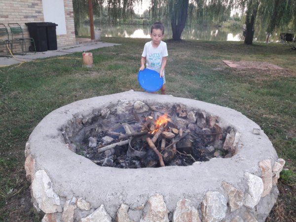 Aznap este szalonnát is sütöttünk, én forszíroztam nagyon az ügyet és nagyon jó, hogy megtettem 🙂 ! Már legalább 1 hónapja ki akartam próbálni a szalonnasütő vasat, amit még júliusban vettünk. A szerkentyű kerek belsejébe kell rakni a szalonnákat, rárakni a parázsra, ahol szépen megsül, arról nem is beszélve, hogy összegyűlik a jó sok finom szaft, amit rácsorgattunk a kenyerekre. Hát, nagyon jó volt, az lett a vacsora akkor, még Toma is imádta és belakott belőle (mondjuk azért persze a szalonnát nem ette, az már túlzás lett volna tőle 🙂 ), de a kenyerekről úgy nyilatkozott, hogy isteni finomak voltak, hármat be is termelt, úgyhogy elhiszem neki 🙂 és persze kérdezte mikor sütünk itthon is 🙂 … Máténak is nagyon ízlett, meg Apucinak is, bár ő azért még akkor is pecázott főleg 🙂 , egyedül hagyma és zöldségek hiányoztak mellé, mert azt persze nem vittünk magunkkal, de majd itthon bepótoljuk legközelebb 🙂 … Itt már a tűzcsiholó segédem 🙂 :