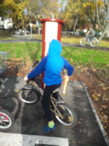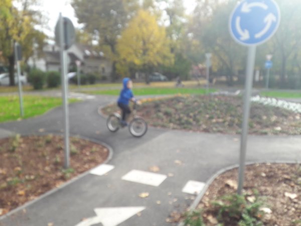 Közel két hete Kresz Park nyílt meg a közelünkben, Csepelen. Biciklivel fél óra lehet az út, autóval 10 pernyire van tőlünk, szóval nem egy távolság. Toma nagyon meg akarta nézni ezt a jó kis helyet, fel is íratta a szünetes bakancslistájára, hogy oda el kell menni 🙂 . Mi most a kis bringát a csomagtartóba berakva kocsival mentünk, mert eléggé vizes volt minden és nem voltam biztos benne, hogy nem ömlik a nyakunkba egy kis zuhé, de biztos megyünk majd bringával is, mondjuk tavasszal 🙂 .Társaságot is készültünk hívni magunkkal, de épp elég volt az időjárással dűlőre jutni, mert az utóbbi napokban elég sokszor esett az eső felénk, az egyeztetés nem fért bele az időnkbe, gondoltunk egyet délután Tomával, hogy most megyünk és kész, ugyanis még a nap is sütött 🙂 (bár amikor ott voltunk beborult). Nem bántuk meg, egyrészt mert még úgyis megyünk, majd akkor hívunk barátokat is, másrészt nagyon élvezetes volt még így magunkban is és persze Tomát sem kell félteni lett társasága, barátkozott az ottani fiúkkal 🙂 . A Park nagyon szuper, tényleg szinte minden van ott kicsiben, működő lámpák, vasúti átjáró ugyancsak lámpával, egy vonattal és hanghatásokkal, körforgalom, természetesen rengeteg kresz tábla és egy mini benzinkút, ami nagy népszerűségnek örvend 🙂 ! Ezen felül sokat kérdezett is Toma táblákról és egyebekről, de csak akkor, amikor nem az újdonsült barátját üldözte, aki átment a piroson és mint rendőr jelölt meg akarta rendszabályozni őt 🙂 … (Sajnos a képek nem a legjobbak, szerintem elromlott a telefonom kamerája)