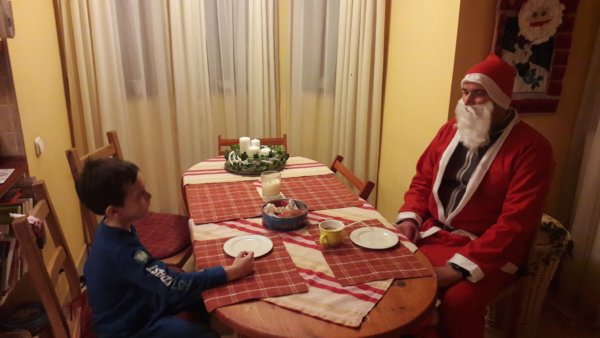 Még forró csokit is készítettünk a Nagyszakállúnak, az egyik szuper itthoni gépemmel főztük, ami őröl, mixel és főz is, kis szépséghibája volt a dolognak, hogy elfelejtettünk – főleg én- bele tejet tölteni 🙂 , szóval 6 percig főztük a csokit, igazán krémes lett, kinyitva a gépet pedig ámulva néztem, hogy hová tűnt a liternyi forró nedű, és csak pillanatokkal később esett le, hogy a tejet azt kifelejtettem a dologból… De sebaj, mert töltöttünk bele pótlásként, a csoki már igazán krémes volt 🙂 , bár Toma kicsit aggódott, hogy nem lesz finom és ilyenek, én inkább a gép miatt szorongtam, hogy túlélte-e ezt az egészet, de a jelek szerint igen, köszöni jól van, és még csak el sem késtünk a dologgal, ugyanis a Mikulásnak igencsak sok dolga volt és jóval később, a tervezetthez képest is jó 1 órával később, este 8 körül ért ide hozzánk.
