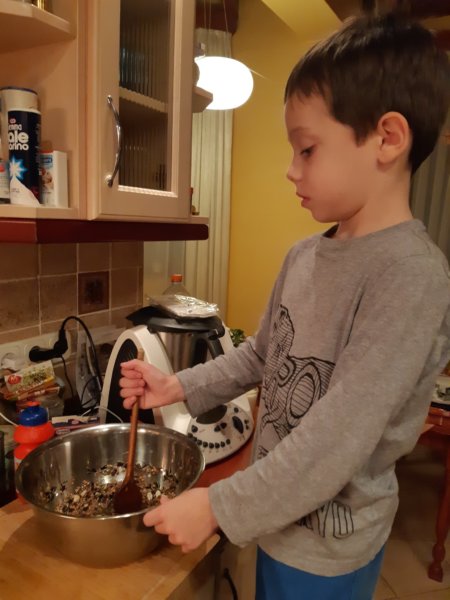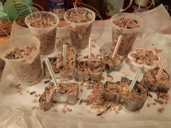 Szóval, a hatodika után jött a hetedike, amikor egy régi tervet valósítottunk meg, madárkalácsot készítettünk a madaraknak a kertbe. A legnehezebb ennél a feladatnál a marhafaggyú beszerzése volt, ugyanis vagy-vagy alapon szerepelt a tervek között és még december elején egyik nap, amikor a piacot jártam, mentem a hentes soron vásároltam itthonra is és ha 3-4 üzletnél nem kérdeztem meg, akkor egynél sem, hogy van-e marhafaggyú, persze sehol sem volt, az egyiknél biztatóan másnap lett volna, míg az egyiknél szerencsém volt és ráadásul tök kedvesen szolgáltak ki, adták ingyen a faggyút, még jó tanácsokkal is elláttak 🙂 . Így aztán nem a faggyú 🙂 , hanem kiszúróformák és egy zacskó madáreleség volt a csomagban aznap. Délután apróra vágtam a faggyút, együtt kiolvasztottuk, Toma hozzákeverte a magvakat, miután hűlt picit, aztán belenyomkodtuk a formákba, néhányat műanyag poharakba töltöttünk zsineggel ellátva, a formák közepére pedig szívószálat szúrtunk, később madzagot kötöttem rájuk. Hűtőbe raktuk, azóta pedig már a teraszhoz közel aggatuk fel őket a cserjére, a faggyúból visszamaradt töpörtyűt pedig beletettem vöröshagyma hálóba és azt is kiakasztottuk, igazi madárkarácsony van főleg a kis cinkéknek, akik jönnek, bár még nem tömegestől, nyilván meg kell találniuk az eleséget 🙂 .