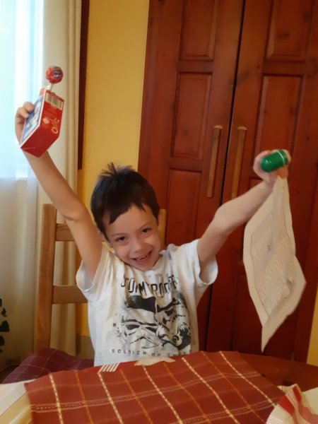 Nyolcadikán lehetett tudni, hogy nem sok időnk lesz, délelőtt a sógornőmék jöttek hozzánk, délután meg Fradi meccsre mentünk. Ezért egy kis kincskereső játék volt a csomagban, bonyolítottam azzal a dolgot, hogy az első két ajándékhoz találós kérdés vezetett, először a fürdőszobai tükörhöz, aztán a porszívóhoz, ahol egy térképet is talált Toma, ami felvezette a szobájába a komódjához, onnan pedig a hálószoba éjjeliszekrényéhez vezetett szintén egy térkép 🙂 , Tomának tuti, hogy az egyik legjobb volt a kincskereső, azóta is emlegeti, szerintem lesz még ilyenben része 🙂 , még pizsamában megtalált mindent úgy 10 perc alatt 🙂 , ami egy labirintus, egy nyalóka, egy hóemberes nyomda és egy Star Wars mini puzzle volt, mindegyiket használatba vette és persze volt amit megevett 🙂 :