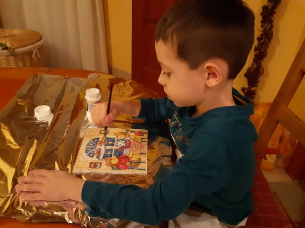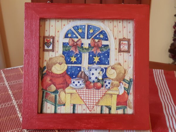 Ezután 9-én egy karácsonyi szalvétás macis kép készült, ami azóta már a komódon díszeleg és azért esett erre a választás, mert Toma az egyik macihoz nagyon hasonló kedvencével, a Brumijával alszik 🙂 . A ténykedést megkönnyítette, hogy szerintem még húsvétról maradt egy lealapozott képkeretünk, így már csak a keretet kellett akril festékkel lefesteni, aztán Toma pacsmagolta a ragasztót a képre, és szerintem nagyon sokat ügyesedett tavaly óta 🙂 :