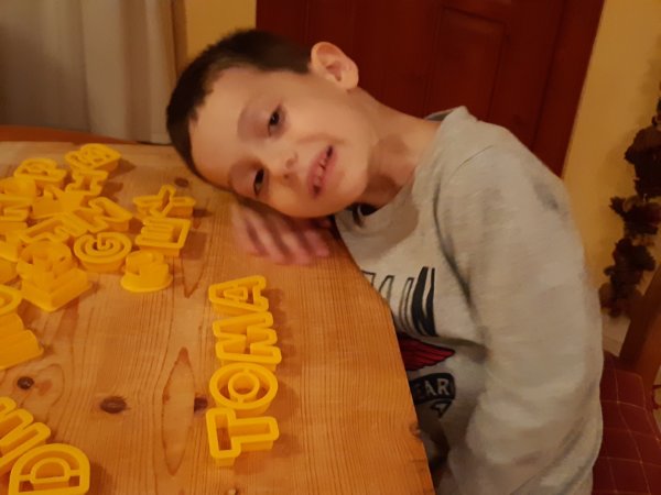 A következő meglepetés 11-én a betűdíszes porcelángyurma készítés volt. Azt tudtam, hogy mindenképpen készítünk valamit porcelángyurmából, a betűdíszek ötlete pedig onnan jött, hogy Toma még december elején egy betűdíszes képet rajzolt és egyébként is nagyon szereti a betűkkel való foglalatosságot, ezért aztán betűkiszúrók voltak a csomagban, ami nagy örömet szerzett! Nyújtott szaggatott, azóta ki is száradtak, még kifesteni nem volt idő őket, vagy így kerülnek a fára, vagy lefestjük még őket, meglátjuk 🙂 :