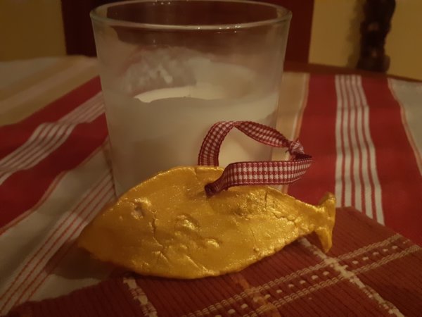 Mivel a Családfőnek két nap múlva volt a szülinapja, akkor kivágtunk neki egy halacskát is a porcelángyurmából, amit száradás után az utolsó pillanatban le is festett Toma arany akrillal és aminek az ünnepelt nagyon örült 🙂 :