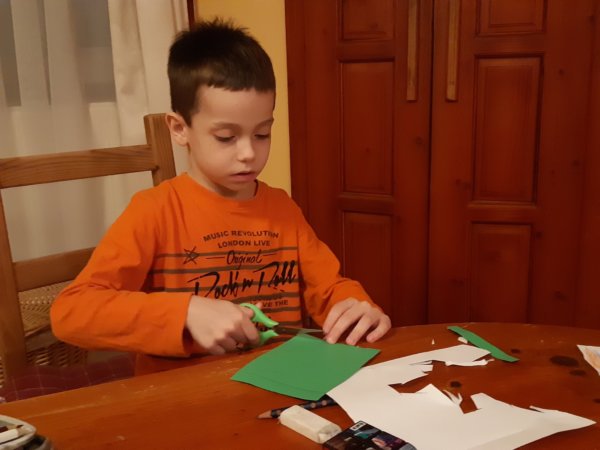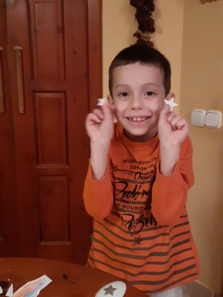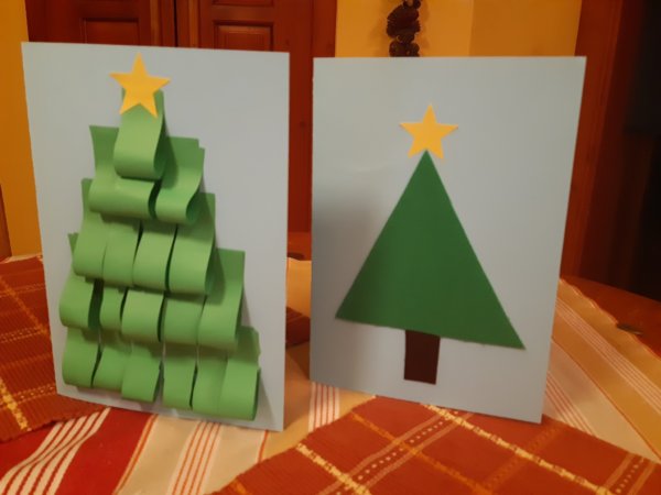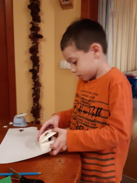 12-én képeslapokat gyártottunk, Toma csíkokat vagdosott zöld papírból és kis segítséggel ragasztott is – mindkettőt nagyon szereti – egy karácsonyfa készült belőle, mint ahogy a másik is az lett, ott filc anyagra rajzoltam karácsonyfa vagy inkább háromszög alapot, meg talpat, Toma kivágta és ragasztotta. Amit külön élvezett, hogy sárga papírból formalyukasztóval csillagokat nyomott ki, az lett a karácsonyfák tetején és a belső lapon végig dísznek ragasztotta: