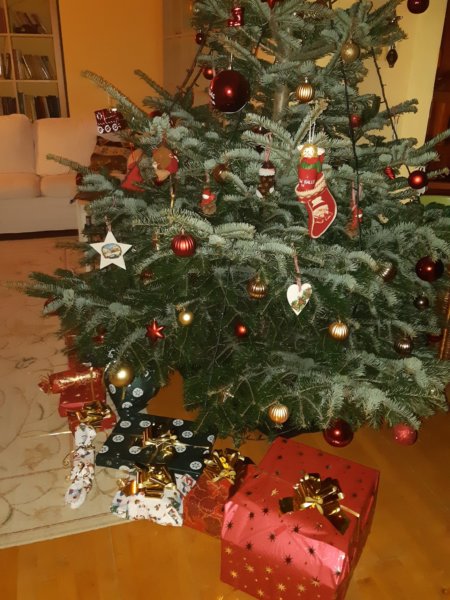 Na, de most azért került egy kis gikszer a gépezetbe, ugyanis idén először és azt hiszem utoljára, online rendeltünk karácsonyfát 🙂 . Hogy mi van… 🙂 ??? Gondolhatják sokan, teljesen jogosan, bár sok mindent rendeltem már neten keresztül, de például ruhát csak ritkán, és ilyennek kellett volna lennie a karácsonyfának is, de hát akkor jó ötletnek tűnt 🙂 … A Családfő vetette fel az ötletet, mert az egyik ismerőse a FB-on hirdette ezt az egészet, de mindketten benne voltunk persze, ki is választottuk még december elején a szép fát, 2, 75 körül volt, és tényleg minden rendben ment, megérkezett a fa, elhozták a fiúk, aztán a fészerbe rakták egy héttel szenteste előtt. Azzal viszont nem számoltunk, hogy amire ideért a fa, a 2, 75-ös magasságból lett olyan 3,10 🙂 és olyan szép terebélyes volt az egész, ami ugye a neten keresztül nem jött át, hogy amikor behoztuk a házba és kibontottuk, picit megint a Chevy Chaze féle Karácsonyi vakáció című filmben érezhettük magunkat – pár éve már volt hasonló esetünk, bár akkor Apuci piacról hozta a fát 🙂 – abban van egy olyan rész, hogy amikor kibontják az erdőből saját kezűleg kivágott fát, az kiüti az ablakokat és lever mindent a nappali közepén…