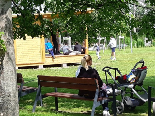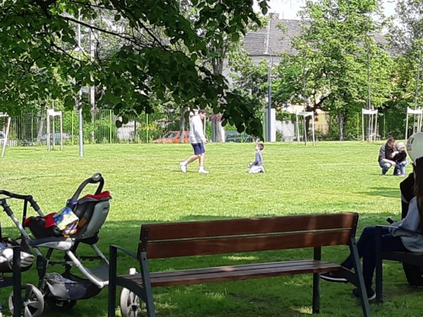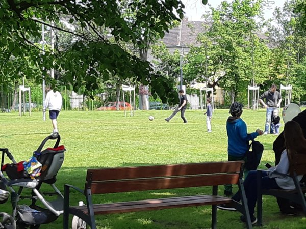 Nagyon furcsa volt az osztályt, az osztálytársak tesóit és a szülőket így együtt látni újra, mindenki örült mindenkinek, a srácok egyből megtalálták egymást és mint mondtam a nagy focipályára robogtak, és jó sokáig ott voltak. Viszont a Kert, na az dugig volt, már parkolóhelyet is alig tudtam vadászni, akkor komolyan megsajnáltam az ott lakókat, a környező utcák ugyanis tele voltak parkoló kocsikkal és ez a Kertben folytatódott, ember ember hátán, nekünk az volt a szerencsénk, hogy a terület végén az egyik, lehet egyetlen asztalra lecsaptak a korán érkezők. Egyébként ott a hátsó részben kevesebben voltak, a focipálya sem volt dugig, viszont a várkastélyos csúszdás részen, ahol pár napja voltunk Tomával, mindenhonnan gyerekek és szülők lógtak, úgyhogy aznap nem is merészkedtünk annak a közelébe, bár szerencsére a focizás hevében ez nem is hiányzott Tomának 🙂 .