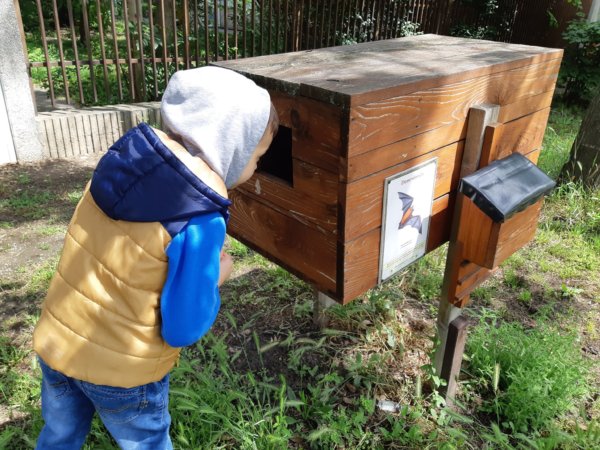 Egyébként meg jól elidőztünk a könyvtárban is, de az előtte lévő madár ösvényen meg főleg, ahol egész évben ki vannak rakva etetők meg odúk, Toma meg kinézett magának egy denevérodút, és ott vizsgálgatta, nézegette, kereste hátha talál benne egy árva denevért, de sajnos csak az üres odút nézegethettük, de azt jó sokáig 🙂 :