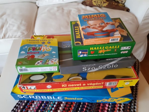 Hihetetlen milyen gyorsan szalad az idő és, hogy ez a jó kis nap is, már egy hete volt! Akkor éppen szakadt az eső -nem meglepően – ráadásul egész nap esett, Toma meg ugye beteg volt és most tényleg abból a kicsit elesett fajtából, levert volt, ha nem lett volna olyan pocsék az idő, akkor is minden bizonnyal maradtunk volna szépen itthon. De így, kérdés sem volt és mivel Toma mostanában, ha megkérdezem ugyan mit is szeretne csinálni, ha ketten vagyunk, egyből a közös játékot mondja, pedig nagyon szeret jönni-menni, de akkor is ez a szíve vágya 🙂 ! Így aztán gondoltam egyet és azt az esős keddet kikiáltottuk játszós-nappá, ami annyit tesz, hogy tényleg egész nap játszottunk, a tervek szerint egészen addig, amíg Máté haza nem ér a suliból, ami kedden elég későre, úgy fél 4 tájékára esik, ugyanis ilyenkor 8 órája van. Ebédünk volt szerencsére, így reggeli után elkezdtünk játszani, többféle kártyajátékkal, mint a Mimiq (grimaszolni kell, nagyon vicces), forma és szín egyeztetőssel a Halli Gallival, amiben csengetni kell, amikor rácsapsz valamire, Tomának ez a legjobb benne 🙂 , számolóssal, ugyan csak 15-ig lehet vele számolni, de többféle bonyolult dolgokkal, ki kell választani mondjuk két lapból a max. legnagyobb összeadást, eljutni 15-ig, aztán kivonással is lehet ugyanezt, persze aki gyorsabb az a nyerő, a Szó-Szóló fejlesztő játék, egészen 3-4. osztályig használható, ez is, mint a Halli Galli, még Mátétól maradt meg, ebben a Szó Szólóban szótagokkal kell játszani, vannak nehezebb és könnyebb kártyák benne, életkortól függően. Aztán a Scrabble Juniorral is nyomtunk pár kört, na meg az elmaradhatatlan Ki nevet a végénnel. Annyira belemerültünk, hogy csak ebédelni álltunk meg és mivel általában mindenből több partit lenyomtunk, még Máté hazaérkezése után is folytattuk az éppen soron következő játékot, nagyjából 6 után eszméltünk, hogy most már nem ártana abbahagyni ezt a maratoni napot 🙂 . Lőttem egy képet, amikor összeraktam a napi játék adagunkat, hogy bevigyem a játszószobába, mert ilyen napi termés sem sokszor adódik azért 🙂 … Nagyon jó volt, biztos lesz ismétlés, az eső után mondjuk egy kánikulai napot tudnék elképzelni erre a célra, de csakis szigorúan medencézésekkel megszakítva 🙂 !