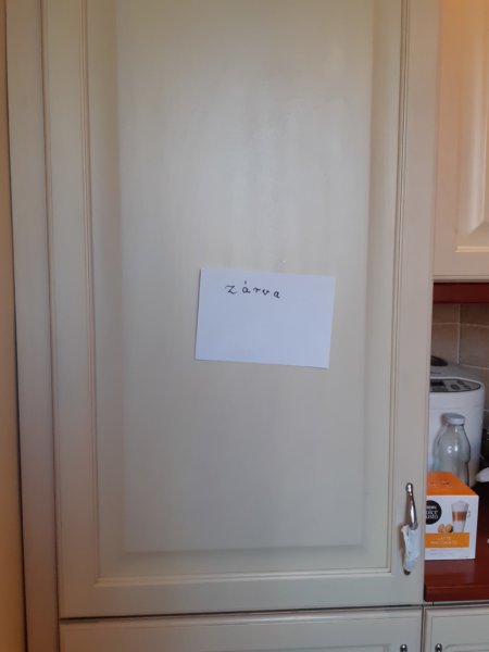 Amikor megláttam, kisebb sokkot kaptam, szemeim előtt megjelent, ahogy a gyönyörű tintafoltos pulton intézem a konyhai dolgokat ezentúl, mert, hogy hogy jön az le az onnan, arról fogalmam nem volt… De amíg én a kiborulás szélén egyensúlyoztam, addig Máté gyorsan rákeresett a gugliban, hogy lehet eltüntetni az alkoholos filcet, és kiderült, hogy fogkrémmel, szódabikarbónával remekül, úgyhogy gyorsan előkaptuk a fürdőből a tubust és tényleg nyom nélkül lejött mindaz, aminek le kellett. Akkor már csak azt kellett kitalálni, hogy a ragasztót, hogy szedjem le a beépített hűtőről, amire a zárva felirat került ugye ragasztva, de végül megoldottam és ezen már csak röhörésztünk mindannyian 🙂 …