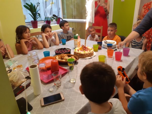 Ez a jó kis szülinap is már pont egy hete volt, ráadásul csak egy fotóm van róla, mert annyira jól elvoltunk mi felnőttek is, hogy többre nem volt érkezésem. Viszont, a gyerekek extra jól érezték magukat és ez volt az első úgymond osztálytársas buli Tomának, szóval mindenképpen szót érdemel 🙂 . Különlegessége még a dolognak, hogy semmi extraság nem volt benne, csak a kert, amiben azért sok minden volt persze, trambulin, kerti medence (!), és a hihetetlen csúszka, amit az ünnepelt apukája csinált és ami olyan jól sikerült, hogy én konkrétan megkérdeztem hol lehet olyat venni 🙂 … Mondanom sem kell, ez volt az egyik fő kedvenc Tománál, meg az összes gyereknél is és aminél valószínűleg annyira el voltam ragadtatva, hogy elfelejtettem egy nyamvadt fotót is készíteni 🙂 . Na de a lényeg, hogy pont a hihetetlen kánikulát lezáró felhőszakadás után kezdődött a kerti buli, így nem is vittünk fürdőnacit, bár kaphattunk volna, de az érintett nem élt vele, mondjuk mások sem hoztak nagyon az előbb említett ok, vagyis a zivatar miatt, de mindenki kapott vagy valahogy összehozta a dolgot. Toma és még pár fiú nem medencézett, nálunk ennek egyszerű oka volt, akkor már eléggé köhögött Toma, így ő maga döntött úgy, hogy most ezt kihagyja, legnagyobb örömömre, mert miközben fürödtek a gyerekek szemerkélt az eső, szóval annyira nem lett volna jó buli. Ezt alátámasztandó, 10 perc múlva már Vince barátja is kint volt a vízből, amibe elég sok gyerek zsúfolódott, így aztán elmondása alapján nem volt annyira szórakoztató 🙂 . Na, de ennyi volt a kisebb nehézség, mert innentől ment a focizás, trambulinozás és persze a végtelen csúszkázás a kertben 🙂 , szegény anyukát sajnáltam is, mert minden gyerek nyakig sáros lett és koszos, hát mit mondjak egy idő után nehéz volt rendet tartani a házban is 🙂 , de ő egyébként jól viselte a megpróbáltatásokat 🙂 … Még az is megfordult a fejemben, hogy felajánlom a szolgálataimat másnap egy takarításra, de hozzánk akkor jöttek Beniék, tudtam, hogy ez nem jön össze, akkor próbáltam ott segíteni amiben tudtam…. Volt persze tortázás is, ezt legalább megörökítettem: