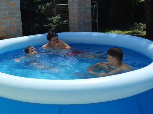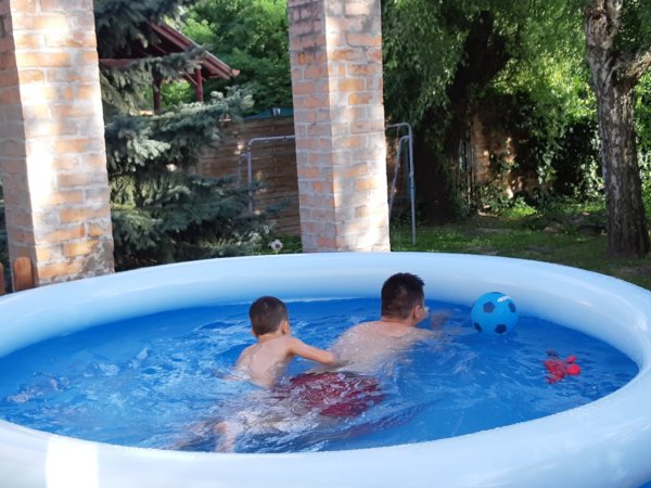 Ami tuti, mondhatnám atombiztos volt eddig a meleg időben, az a medencézés volt természetesen. Benivel, barátokkal, de bármilyen program után is ott landoltak a fiúk, én is partner vagyok ebben persze amikor tehetem. Ha itthon vagyunk és meleg van, na akkor aztán annyi fürdés megy, amennyi csak lehetséges, egy nap sokszor, bár igyekszünk tényleg betartani a 11-15 közötti fürdés szünetet, de volt már rá példa azért, hogy nem bírták ki és mondjuk kettő körül már a medencében voltak, vagy mielőtt Beni elutazott dél körül volt egy búcsú fürdés, de normál esetben azért próbáljuk tartani az ütemtervet 🙂 .