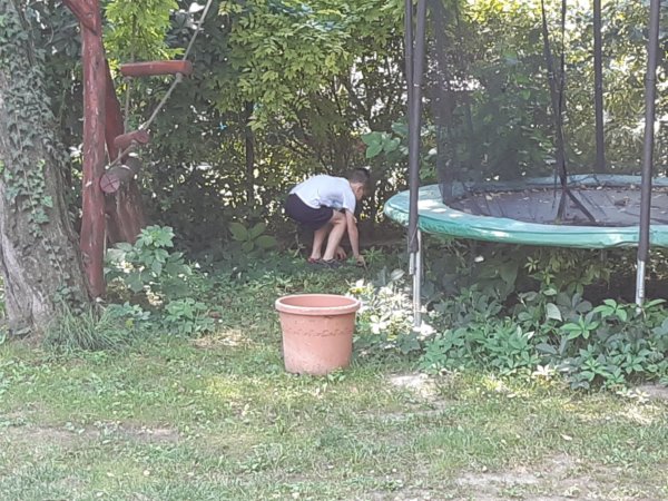 Az itthoni napokban segítenek is a fiúk, főleg a kerti munkákban. Máté felásta nekem a jó későn elültetett veteményest, de remélem azért lesz paradicsom és cukkini termésünk, most ő nyírja a füvet, Toma a palánta ültetésben és főleg a locsolásban jeleskedik, na és ő az, aki a fűnyírás előtti takarítást elvégzi, ami annyit tesz, hogy a nem kevés tobozokat összegyűjtögeti egy nagy kaspóba, ami már most tudom, hogy nagyon fog hiányozni ősszel, amikor a jónép iskolában lesz és én nyírhatom a füvet is 🙂 …