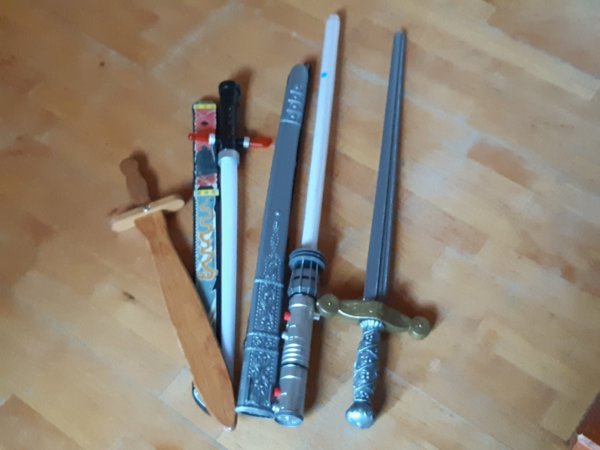 Aztán mi van még itthon, többször vannak nálunk Toma barátai egy-egy napra vagy délutánra, akkor aztán megy a focizás, fürdés és mindenféle játék, ami követhetetlen nekem, egyszer csak egy padlón felejtett kardgyűjteményt fotóztam le, mert annyira jellemző volt arra a napra 🙂 :