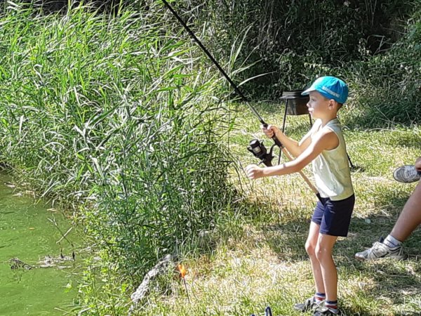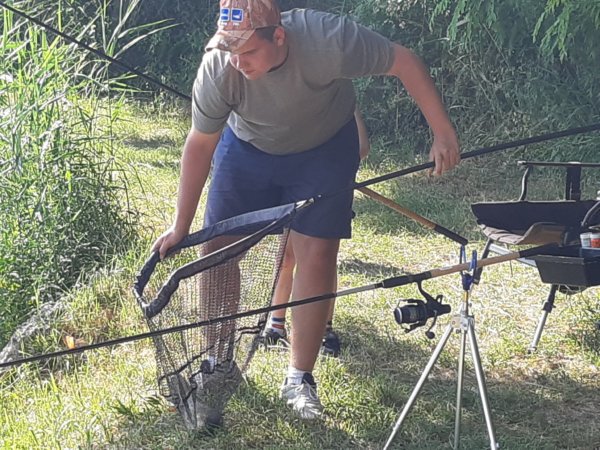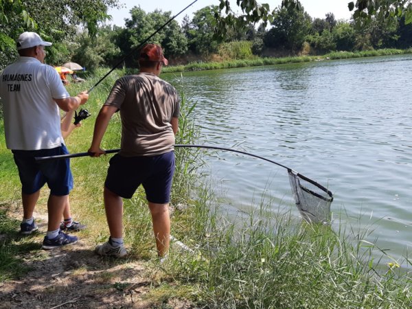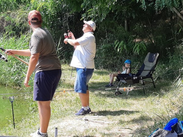 Szóval beszéltünk délelőtt telefonon és mivel este 7-ig tartott a verseny és alig volt valami mozdítás az egész tavon, az 1 órás, horgász szünetes ebédidőben mentünk le hozzájuk, itthon mi is ettünk, aztán indultunk. Azt már megérkezésünkkor lehetett tudni, hogy dobogóra esélytelenek a fiúk, mert délelőtt több haluk elment és ugyan mindenki alig fogott valamit a tavon valószínűleg a meleg miatt, azért akadt egy-két versenyző, aki már fogott, például egy 10 kilós halat. Hát, szóval nekiálltak újra pecázni, Tomának is bedobtak persze, aztán elkezdtek jönni a halacskák, Toma meghozta a szerencsét 🙂 … Apa is fogott, meg Máté is persze és Toma meg kifogott egy 7 kilós halat, ami nem számított sajnos sehova… A lényeg, hogy mindenki örült a végére, pedig jó meleg is volt, én meg ott voltam mellettük és olvastam, szóval igazán jó kis relaxáló délután volt az a szombati 🙂 .
