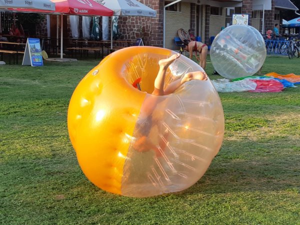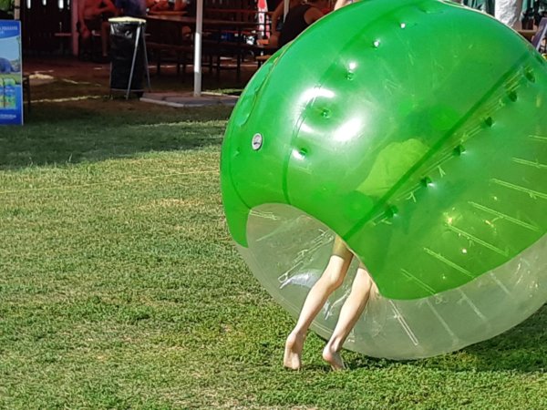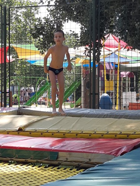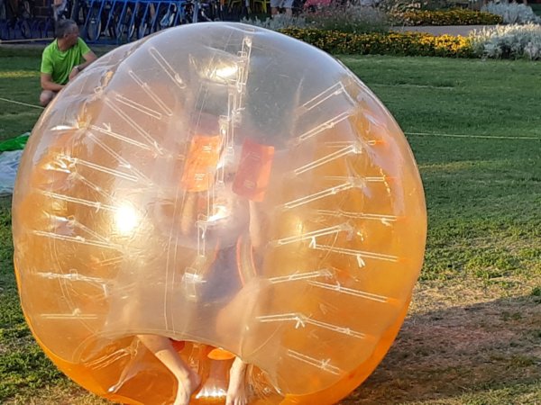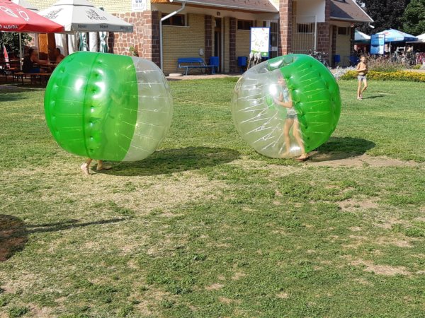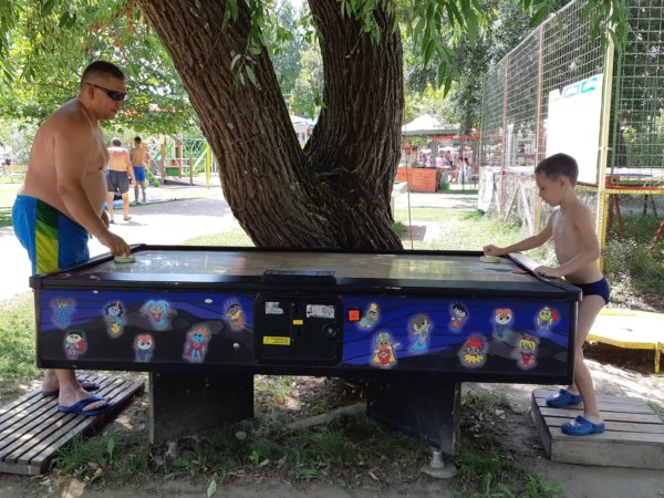 Szóval sokszor, rengetegszer és sokáig voltunk a vízben, ott általában labdáztunk, néha mi úszkáltunk, vasárnap vettünk ki egyszer vízibiciklit, mert azt is nagyon szeretjük, felváltva tekertünk és kormányoztunk, Toma aktív részvételével, de hétfőn már annyira nagy volt a hőség, hogy terveztük ugyan, hogy megyünk még egyet, de egyszerűen jobb volt a vízben, mint a vízibringán 🙂 . Közben, amíg nem fürödtünk, általában ettünk vagy fagyiztunk, Toma pedig vagy játszóterezett, de legfőképp buborékozott, trambulinozott vagy léghokizott valamelyikőnkkel, ugyanis a strandon van egy Élménypark az árnyas fák alatt, úgyhogy Toma próbálta kiélvezni, amennyire csak lehet 🙂 , egyértelműen a buborék – amiben bukfencezni, ha van partner egymással “lökdösődni” is lehet 🙂 – és a léghoki volt a sztár 🙂 :