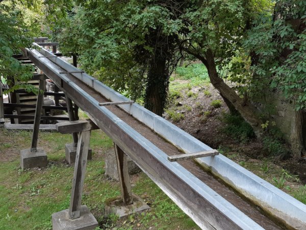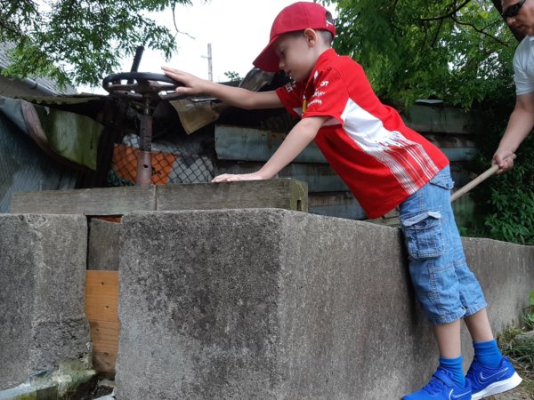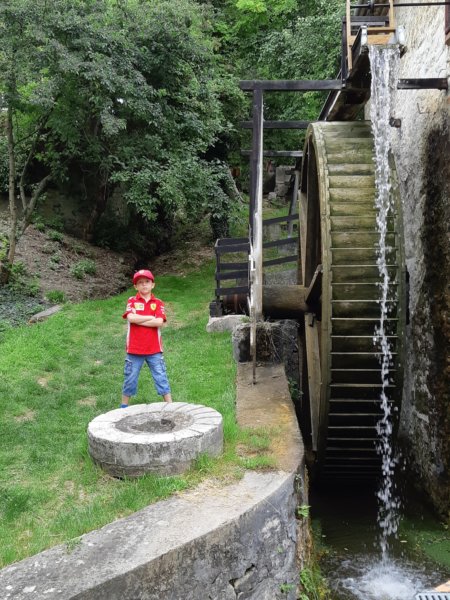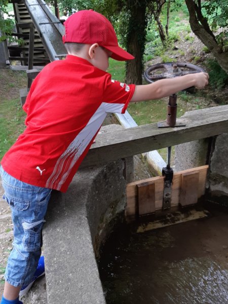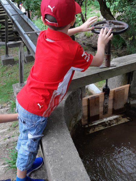 Délben bezárt a malom, egytől nyitott újra, úgyhogy mi nyitásra ott voltunk. Az épületbe meg nem lehetett bemenni, így a kertben nézelődtünk, ahol egy nagyobb fiú éppen a malom vizét nyitogatta-csukogatta. Ha már így alakult, ezt Toma sem hagyhatta ki, és tulajdonképpen ez volt a vízimalom legnagyobb élménye abban a 10 percben Tomának mindenképpen, hogy ő irányíthatta a vizet a malomnál, hol elzárta, hol megnyitotta, nekünk is érdekes volt az egész, olyan volt mint egy zsilip, ami itt a Kis-Dunán, nálunk is szabályozza a vizet és Toma állandóan kérdezgeti, hogy van ez, hogy egyszer magasabb, egyszer meg alacsonyabb a vízszint nálunk és kíváncsi hogy működik, szóval most kicsiben kipróbálhatta 🙂 :