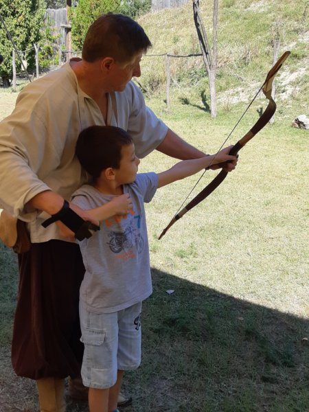 Toma és Vince körében óriási sikere volt az íjászatnak, szerencsénk is volt, mert a két nap közül vasárnap mentünk, ami mindenképpen a szellősebb időpont volt, ott mondta is az íjász bácsi, hogy szombaton rengetegen voltak és én is úgy emlékeztem, hogy amikor két éve ott jártunk, szinte tumultus volt, úgy látszik az a kelendőbb nap. Ennek mi mondjuk nagyon örültünk, mivel tényleg kényelmes volt minden, de ami a legfontosabb, hogy nem voltak kígyózó sorok az íjászatnál és egy lövészetnél akár 8-10 nyilat is el lehetett lőni, ami fontos szempont volt a fiúk részéről 🙂 ! Ki is használtuk mindezt az utolsó percig, ugyanis többször visszamentünk nyilazni, még mielőtt indultunk akkor is lődözni kellett párat, ez a pár olyan 15 percet jelent egyébként 🙂 . Annyira megtetszett, hogy a fiúk íjászatra akarnak járni, viszont régebben volt szombatonként az Emese Parkban ilyen oktatás – ezt is az előző látogatásunkkor tudtuk meg, mert akkor is már ezen gondolkoztunk – viszont most már megszüntették, úgyhogy ez a terv kicsit dugába dőlni látszik. Pedig a fiúk ügyesek voltak, Toma nagyon jól belejött, többször eltalálta a céltáblát és messzire tudott lőni a nyíllal, ami nagy dolog, mert egyedül kihúzni is elég nehéz azt az íjat, hát még lőni és célozni is vele! Ez a fotó még az első íjazásnál készült, a bácsi, aki egyébként nagyon kedves volt, éppen a mozdulatot mutatja: