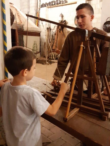 Toma még valami középkori kőhajító gépet is kipróbált, neki kellett tekerni és kilőni is, hát az is nagyon szuper volt 🙂 :